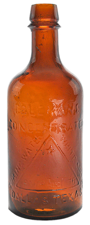 | Embossed: COLEMAN'S / CONCENTRATED / (/) SPRING WATER (\) WHITE SULPHUR / (motif of triangle containing motif of star) / PATD Aug 1 '76 / DALLAS TEXAS // c // |