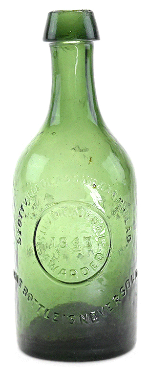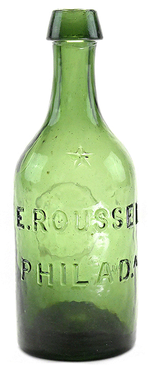Embossed: (5 Pointed Star Motif) / E. ROUSSEL / PHILAD.A // ( ) DYOTTVILLE GLASS WORKS PHILAD. / ( ) SILVER MEDAL / 1847 / ( ) AWARDED / ( ) THIS BOTTLE IS NEVER SOLD // |
