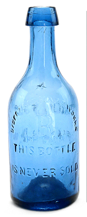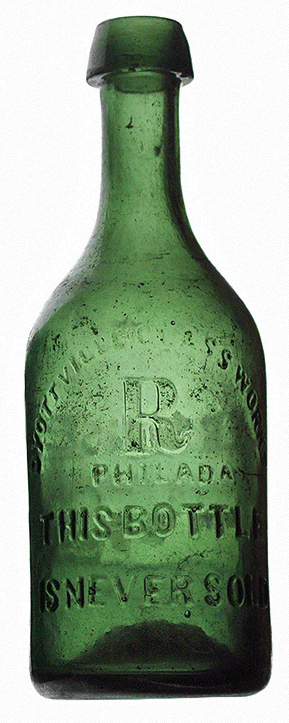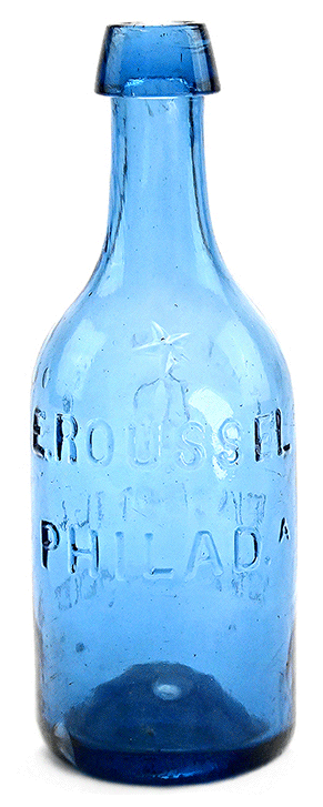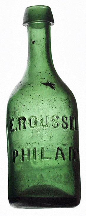 Embossed: (5 pointed star motif) / E. ROUSSEL / PHILAD.A // ( ) DYOTTVILLE GLASS WORKS / R (solid block letter) / PHILAD.A / THIS BOTTLE / IS NEVER SOLD // |